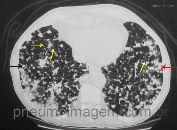 Ground-glass opacities with thickened interlobular septa (mosaic pattern) - red arrow. Confluent nodules to form areas of consolidation (black arrow). Areas with cystic formations consistent with emphysema or pseudo-bubbles (yellow arrow). Current studies of radiological-pathological correlation postulate that occur metastases with airborne spread (aerogenous metastases) in lung adenocarcinoma. Cancer cells grow along the alveolar septa at the primary site detached from the basal membrane, are distributed through the airways and return to fix and grow along the alveolar septa, away from the primary focus.