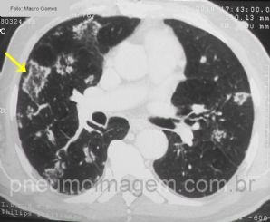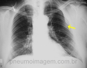 Paciente se apresenta com dispneia. Você acha que a lesão apontada pela seta é a causa do sintoma? Deixe seus comentários abaixo. ***** Patient has dyspnea. Do you think the lesion of the arrow is the cause of the symptom? Write your comments below.