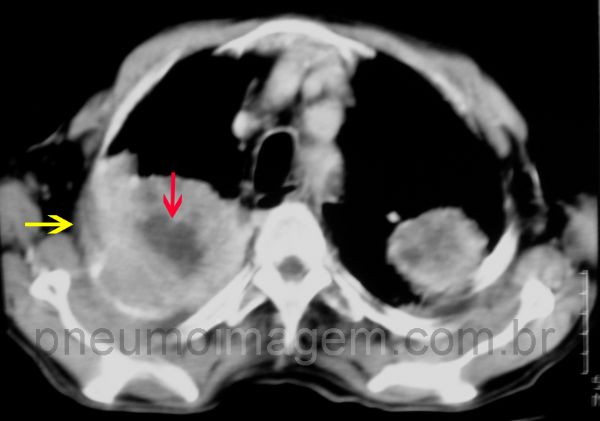Corte tomográfico demonstrando as massas apicais. Observe a necrose central (seta vermelha) e a invasão da parede torácica (seta amarela).
