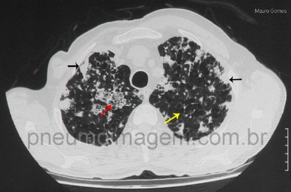 Áreas de opacidades em vidro fosco com septos interlobulares espessados no seu interior (aspecto de pavimentação em mosaico) - seta vermelha. Nódulos confluentes formando áreas de consolidação (seta preta). Áreas com formações císticas compatíveis com enfisema ou pseudobolhas (seta amarela). Estudos atuais de correlação radiológica-patológica postulam que ocorram metástases com disseminação por via aérea (metástases aerógenas) no adenocarcinoma de pulmão. As células cancerosas crescem ao longo dos septos alveolares no local primário destacadas da membrana basal, distribuem-se através das vias aéreas e voltam a fixar e a crescer ao longo dos septos alveolares, longe do foco primário.