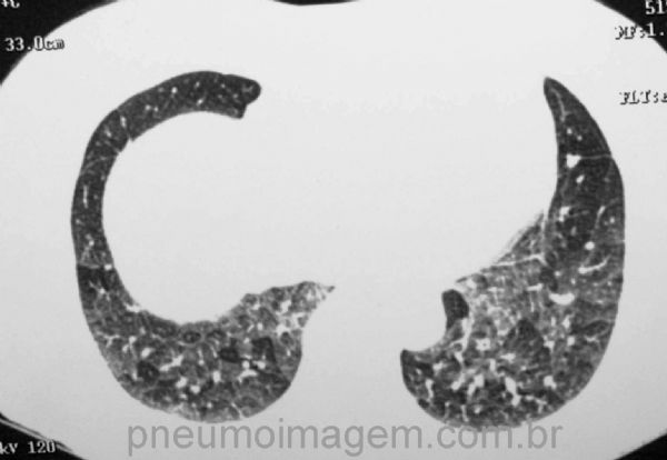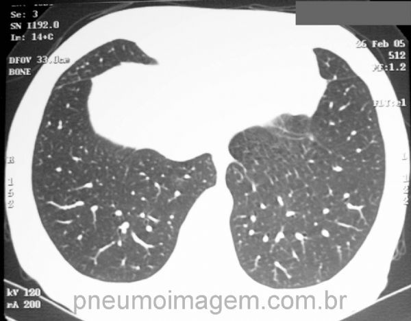Corte na mesma altura da imagem anterior, agora com o paciente em expiração. Observe as diferenças de atenuação no parênquima pulmonar, com áreas mais escuras entremeadas com áreas mais claras. Este é o chamado padrão de perfusão em mosaico, compatível com aprisionamento aéreo.