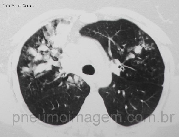 Bronquiectasias centrais no lobo superior direito com impactação de muco (sinal do dedo de luva)