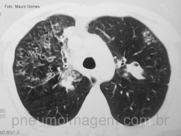 Mesmo doente da imagem anterior, com corte na mesma altura, após tratamento. Observe as bronquiectasias no lobo superior direito, agora sem a presença de muco no seu interior.