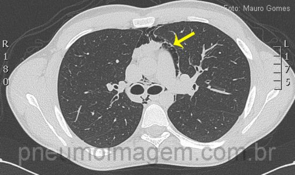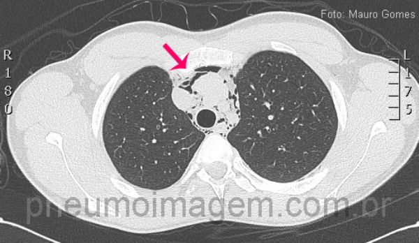 Corte tomográfico ao nível da traquéia demonstra a presença de ar dissecando as estruturas mediastinais e vasculares (seta vermelha). No pneumomediastino espontâneo não há evidências de traumatismo, iatrogenia ou pneumopatias prévias. Por se tratar de uma afecção incomum, eventualmente o diagnóstico não é feito, o que pode trazer consequências danosas e até mesmo fatais para o paciente.