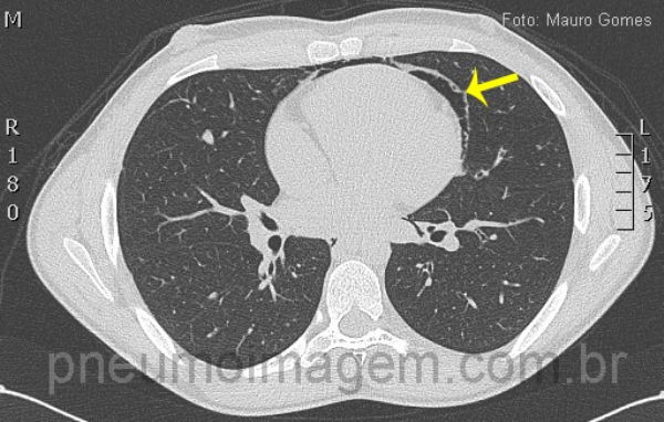Neste corte observa-se o ar deslocando a pleura mediastinal e formando uma linha que circunda o coração (seta). Este é um jovem paciente do sexo masculino, com 19 anos, que sentiu dor torácica e dispneia durante uma partida de futebol.