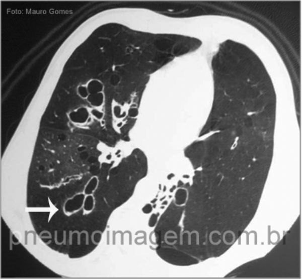 Neste corte tomográfico referente ao mesmo paciente da imagem anterior, observam-se extensas bronquiectasias centrais (seta branca) associadas ao padrão de perfusão em mosaico, que pode ser atribuído ao aprisionamento aéreo provocado pela doença.
