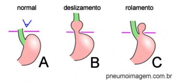 Na hérnia de hiato por deslizamento, a junção gastresofageana se move para cima do diafragma (figura B); na hérnia por rolamento (ou paraesofageana), uma parte do estômago hernia através do hiato esofágico e fica ao lado do esôfago, sem movimento da junção gastroesofágica (figura C). Um terceiro tipo também é por vezes descrito, sendo uma combinação dos tipos I e II.