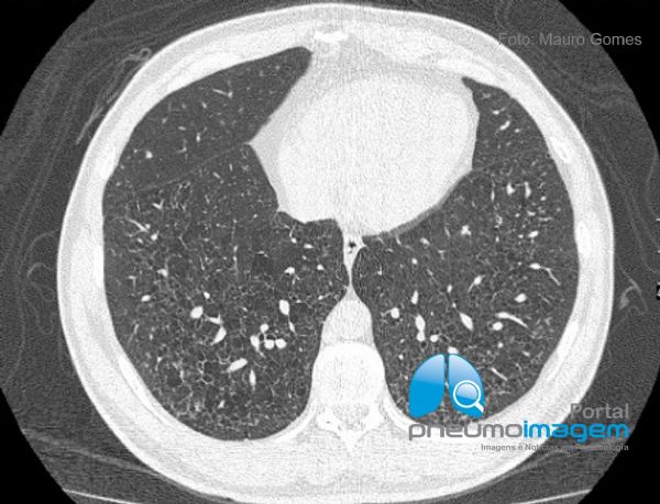 Comprometimento pulmonar da Histiocitose de Células de Langerhans caracterizado por pequenos cistos arredondados de paredes finas, bilaterais, de distribuição difusa e homogênea pelas regiões centrais e periféricas dos pulmões. Ainda há espessamento de septos interlobulares e discretas áreas em vidro fosco.