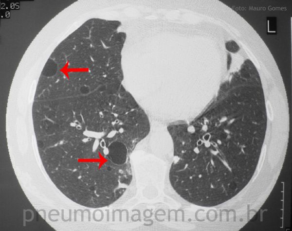 Pulmonary involvement affects about 10% of cases and may be the first manifestation of the disease, interstitial fibrosis and xerotraqueia are the most common. Obstructive bronchiolitis is a result of lymphocytic invasion of epithelium. The lymphocytic infiltrate in the parenchyma characterizes lymphocytic interstitial pneumonia (LIP, LIP) and has the most severe complication of the disease is pulmonary lymphoma. The most common CT findings are ground-glass opacity (yellow arrow), consolidation and thin-walled cysts (red arrow).