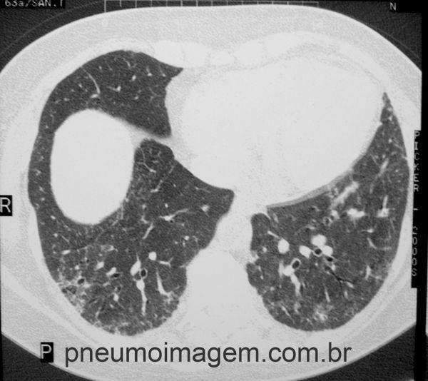 Detalhe de corte tomográfico com distorção da arquitetura pulmonar com bronquiectasias de tração.