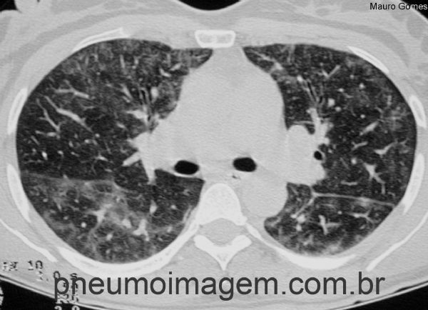 Corte tomográfico em alta resolução (TCAR) com opacidades irregulares em vidro fosco difusas e bilaterais.