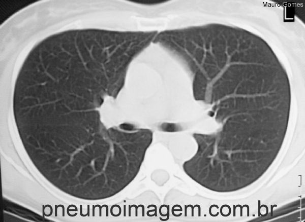 Mesmo paciente em corte tomográfico realizado na mesma altura da imagem anterior e após a suspensão da droga e uso de corticóide. Houve regressão total das lesões pulmonares.