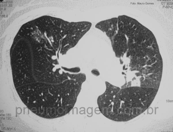 Opacidades apicais irregulares bilaterais, com predomínio no lobo superior esquerdo.