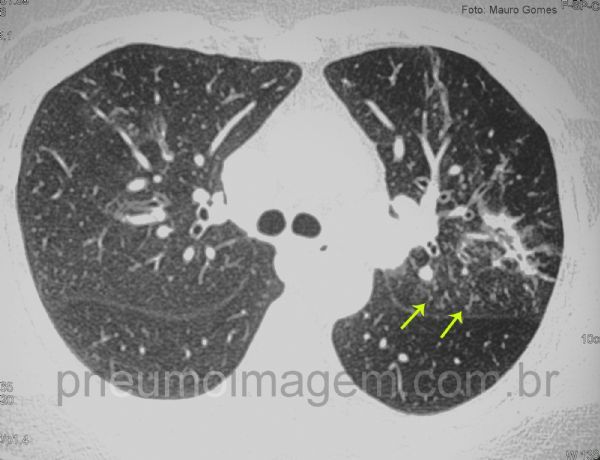 Alguns nódulos centrolobulares (setas amarelas) à esquerda, alguns à direita em menor número em topografia de lobo médio.