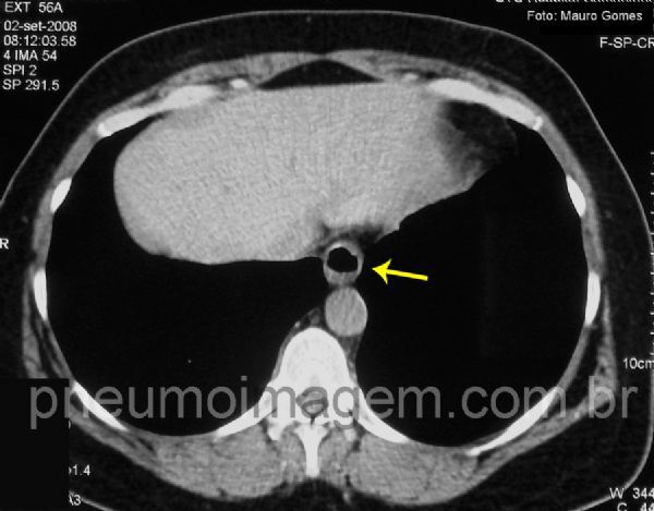 Pequena hérnia hiatal (seta amarela) sugerindo a presença de refluxo.