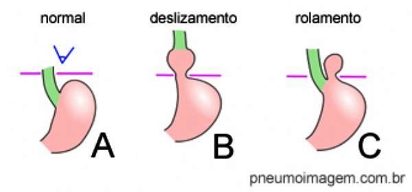 Na hérnia de hiato por deslizamento, a junção gastresofageana se move para cima do diafragma (figura B); na hérnia por rolamento (ou paraesofageana), uma parte do estômago hérnia através do hiato esofágico e fica ao lado do esôfago, sem movimento da junção gastroesofágica (figura C).