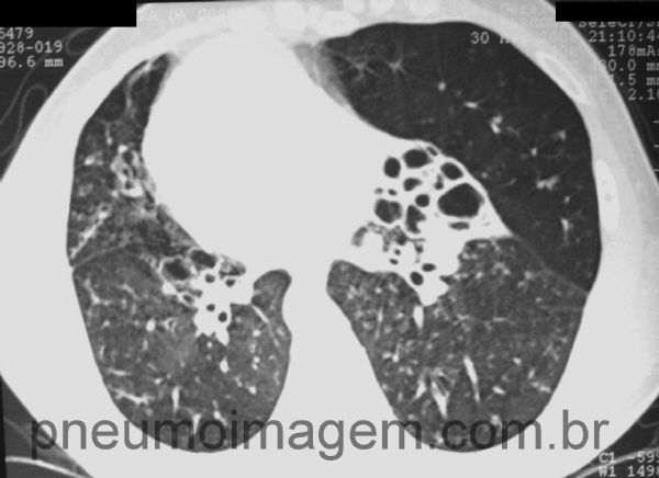 Dextrocardia e bronquiectasias. Observe a hiperinsuflação compensatória do lobo inferior, com pobreza vascular.