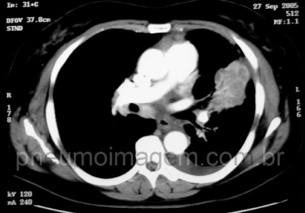 Linfangite carcinomatosa pulmonar refere-se ao crescimento tumoral no sistema linfático dos pulmões. É mais comum de ocorrer devido ao câncer de mama, pulmão, estômago, pâncreas, próstata, útero e tireóide. NesSa imagem, observa-se o tumor primário pulmonar.