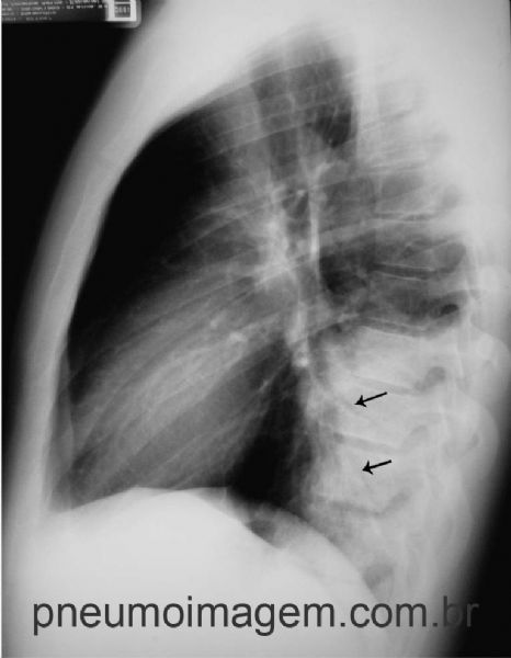 A incidência em perfil caracteriza bem a localização no lobo inferior. Observe que a sombra cardíaca encontra-se normal. Há a presença de broncogramas aéreos no interior da opacidade (seta).