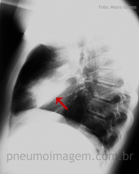 A opacidade em lobo médio pode ser mais bem caracterizada pela incidência em perfil. Observe que a lesão se sobrepõe à sombra cardíaca e está delimitada pela fissura oblíqua (seta). Chaves: cissura oblíqua.