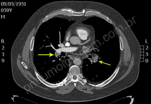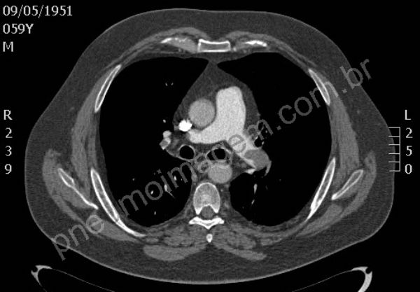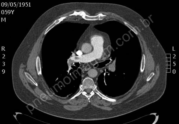 Tromboembolia pulmonar (TEP). Na sequência tomográfica observam-se trombos localizados no tronco da artéria pulmonar e nos principais ramos segmentares à esquerda. Os trombos na bifurcação do tronco pulmonar à direita estendem-se para ramos segmentares do lobo superior, para a interlobar descendente e ramos segmentares do lobo médio. O paciente apresentava também trombose venosa profunda (TVP) na veia femural esquerda, fator de risco importante para TEP. Chaves: tromboembolismo, embolia pulmonar.