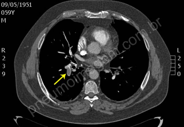 Pulmonary thromboembolism (PTE). In tomographic sequence are observed thrombi located in the main pulmonary artery and major segmentary branches left. Thrombi in the bifurcation of the pulmonary trunk right extend to segmentary branches of the upper lobe, extend to descending interlobar and segmentary branches of the middle lobe. The patient also presented deep vein thrombosis (DVT) in the left femoral vein, an important risk factor for PE. Keys: pulmonary embolism (PE).