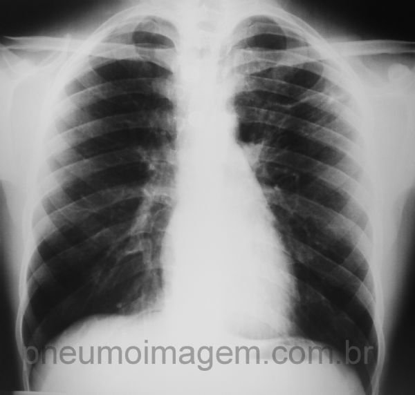 Radiografia do mesmo paciente após o tratamento. Observe a resolução das antigas opacidades, permanecendo imagens cicatriciais (estrias) em lobo superior esquerdo.