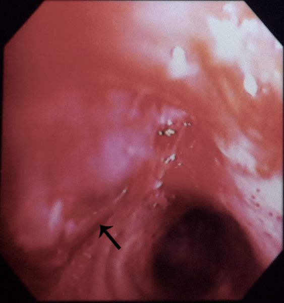 Nesta imagem obtida por broncoscopia de outro caso semelhante, observa-se oclusão do brônquio do lobo superior por lesão de aspecto liso e violáceo (seta). O anatomopatológico mostrou processo inflamatório crônico granulomatoso com necrose caseosa e pesquisa de BAAR positiva no material.