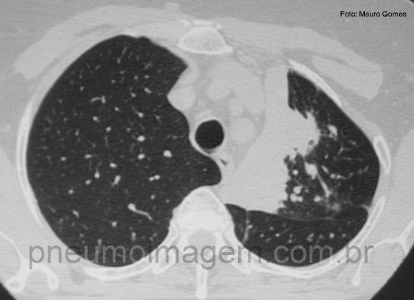 Neste corte tomográfico se observa a atelectasia parcial do lobo superior esquerdo. Há nódulos centrolobulares na periferia da lesão que podem corresponder a disseminação broncogênica da tuberculose.