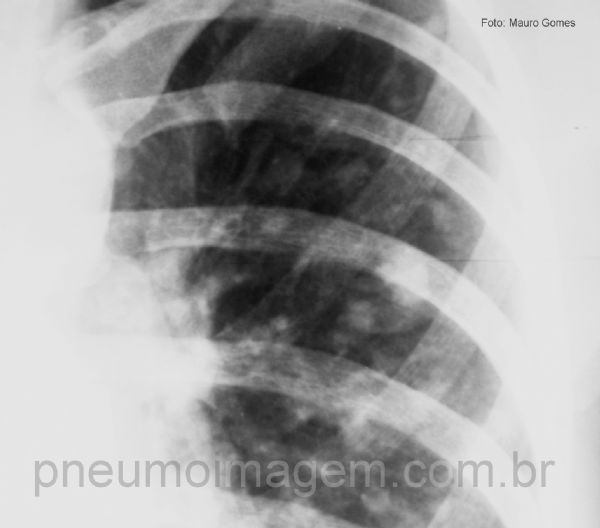 Massa no mediastino que borra o contorno cardíaco à direita, indicando que a lesão deve ser anterior (seta amarela). Há inúmeros nódulos bilaterais (setas pretas) indicando disseminação metastática da doença.