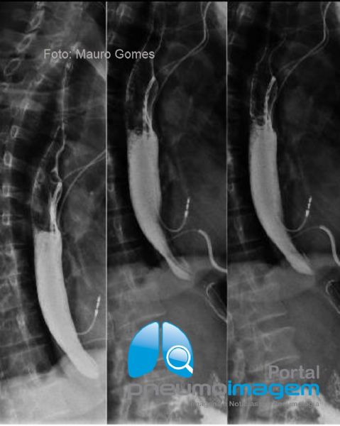 Há peristaltismo aumentado do esôfago distal nos momentos de "espasmo" numa tentativa de esvaziamento, em posição ortostática. Ausência de sinais de hérnia hiatal ou de refluxo gastroesofágico nas diferentes manobras.