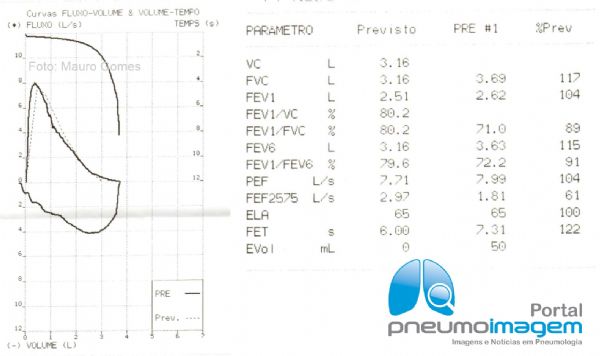 A espirometria sugere um distúrbio obstrutivo leve caracterizado pela redução da relação FEF25-75/CVF. Possui elevadas contagem de eosinófilos no sangue periférico (1620 cel) e dosagem Ige sérica (109, perfil RAST classe 2 para poeira e barata). Histórico de arritmia cardíaca e necessidade de implante de marca-passo.